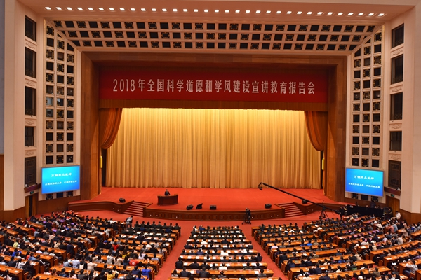 10月15日,中国科协、教育部、中科院、社科院、工程院、自然科学基金委和北京市政府共同主办的2018年全国科学道德和学风建设宣讲教育报告会在人民大会堂举办。全国政协副主席、中国科协主席万钢代表主办单位致辞,中船重工719所名誉所长、工程院院士黄旭华,西湖大学校长、中科院院士施一公,中国科协党组书记、常务副主席、书记处第一书记、中科院院士怀进鹏先后作宣讲报告,教育部党组成员、副部长朱之文主持报告会。来自首都高校、科研院所以及部队院校等40余个研究生培养单位的研究生新生近6000人现场聆听报告。据不完全统计,全国31个省(区、市)和超过500余所高校、研究院所设立分会场通过网络视频同步收看报告会。