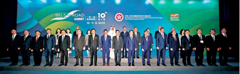 香港特区行政长官李家超(前排左九)、中央人民政府驻港联络办主任周霁(前排右八)、海南省委书记冯飞(前排左五)等嘉宾在第十届“一带一路高峰论坛”上合照。香港特区政府新闻处图
