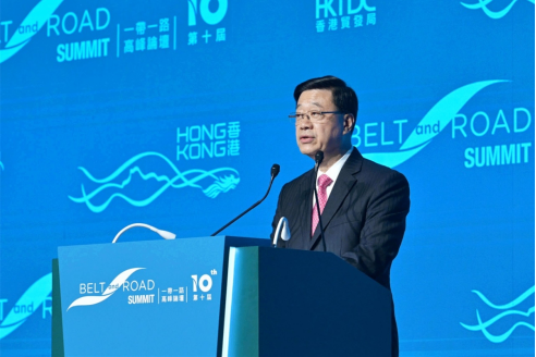 香港特区行政长官李家超在第十届“一带一路高峰论坛”上发言。香港特区政府新闻处图