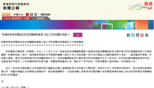 财库局发言人表示,由财库局局长许正宇领导的专责小组在10月公布并落实一系列先行措施以加强防范欺诈行为后,一直持续探讨更进一步的优化措施,现已完成检视现行政府采购制度的工作。而就采购樽装饮用水事件进行的纪律调查亦在不久前完成;政府现正审视调查报告的内容,并征询律政司意见,以决定应采取的纪律行动。有关结果会尽快公布,预计于下月内完成,然后与专责小组的报告一并作总结公布。